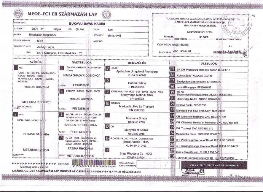 Rhodesian Ridgeback Kadiri, Original Ahnentafel